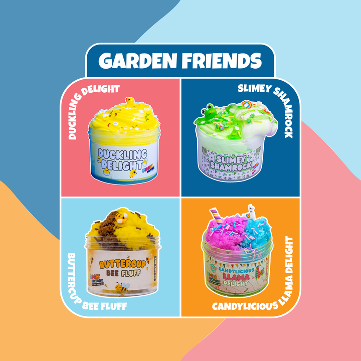 Step into a magical garden of squishy fun with Garden Friends, a cheerful slime bundle inspired by adorable critters and fresh spring vibes! Featuring four vibrant, scented slimes, each with its own charming character and texture, this set is perfect for sensory play, creativity, and moments of mindful joy.